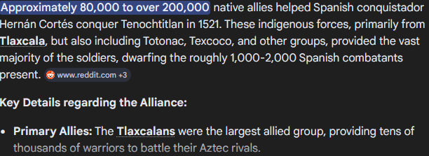 >>220224060Aztecs got rekt and it wasn't just because of the Spanish but the thousands upon thousands of native allies they had that all had blood feuds with the Aztecs (very evil people) and were happy to help genocide them.