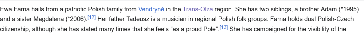 >>220233539What do you know about the region called Zaolzie (= the land beyond the Olše River)?https://en.wikipedia.org/wiki/Trans-OlzaPoleniggers are still upset that it's not theirs, and there is a large Polish minority with Czech citizenship.She isn't and never will be Czech, even though she speaks Czech. Her name is Ewa, not Eva.