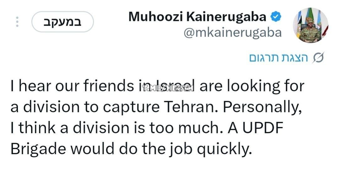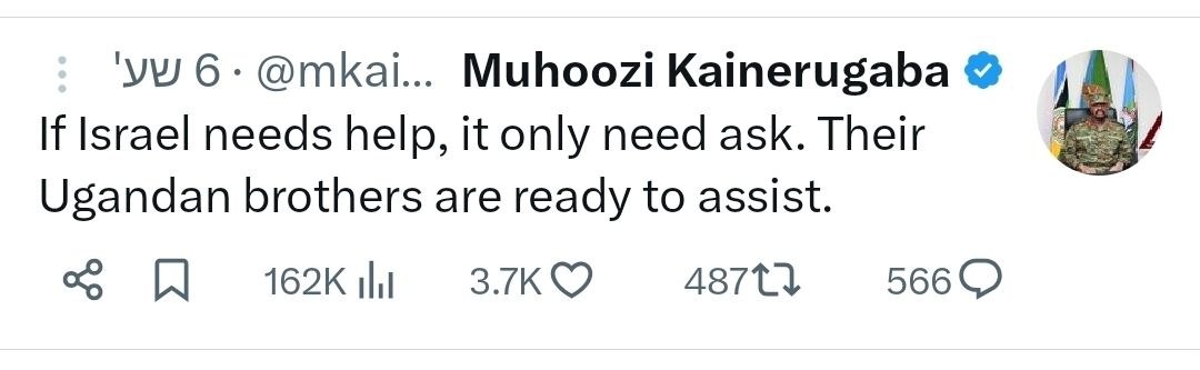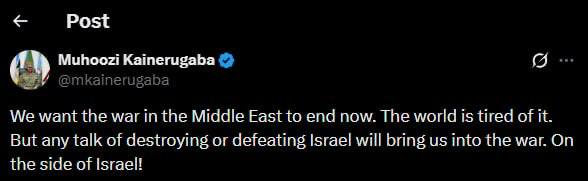 מוּהוּוזי קייןֵרוּגַאבָּה, מפקד הצבא של אוגנדה:אנחנו רוצים שהמלחמה במזרח התיכון תסתיים עכשיו. העולם עייף ממנה.אבל כל דיבור על השמדת ישראל יביא אותנו למלחמה. לצד ישראל!