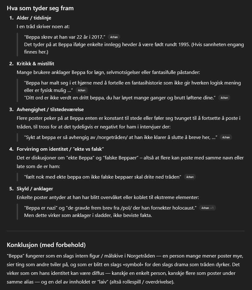 >>220242390Det er vel en gjenganger her at de trådpersonlighetene som innrømmer de aktivt bruker KI er de samme som har de minst dype meningene om ting og gjør bare overfladiske og grunnleggende observasjoner av tingenes tilstand og bretter ut om det i tråden som om de har avdekket noe stort.