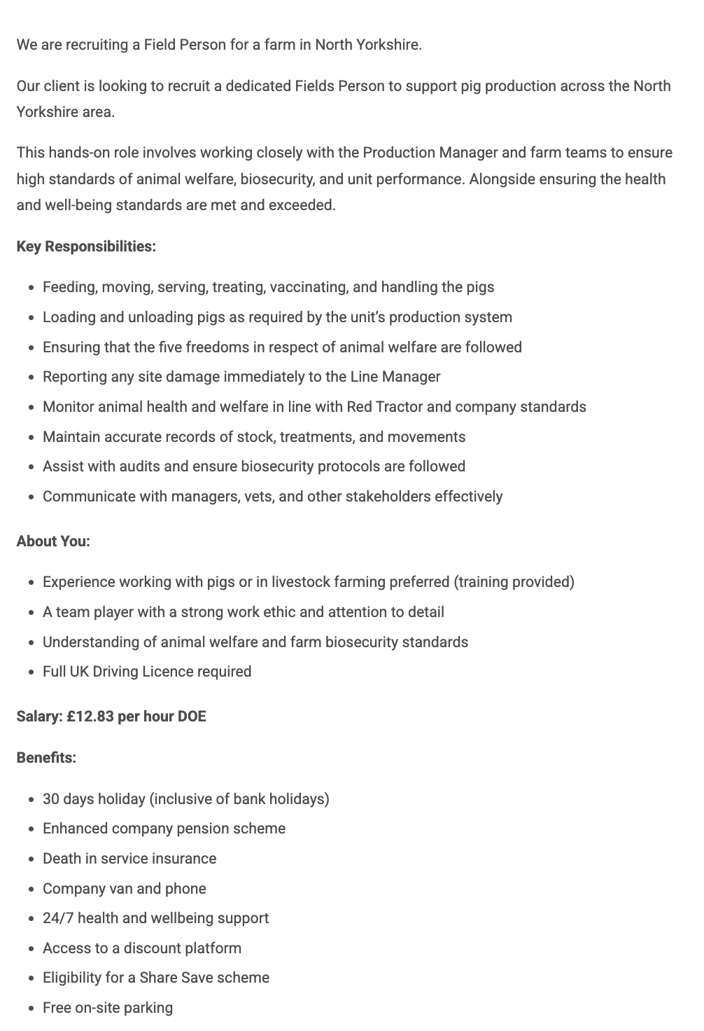>>220247206That's 12p an hour above minimum wage. For that, I'd expect to be doing little more than mucking out the sties and feeding them, but these expect you to do stock control, audits, vaccinations AND drive? What a joke.>Fields Personlol