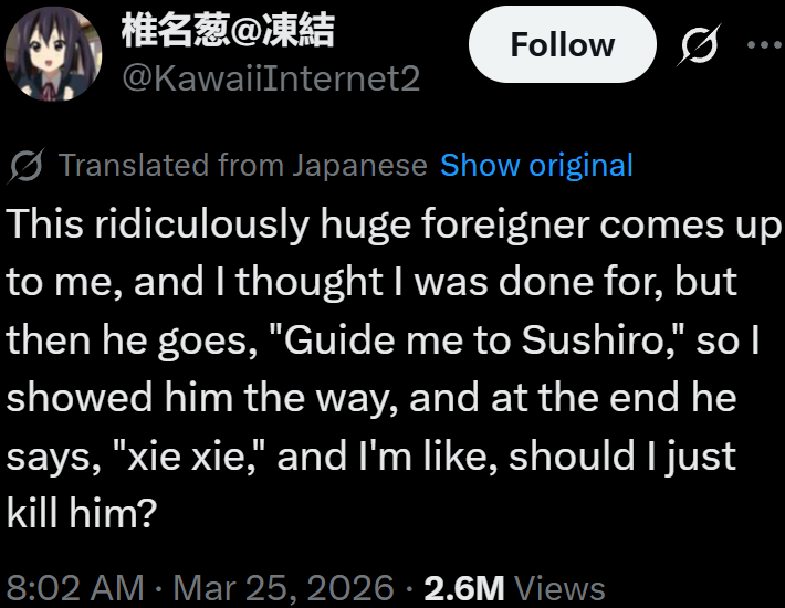 one time a non-mainland chinese tourist women asked me for directions I accidentally said "thank you" instead of "no problem" after telling them where to go out of nervousness