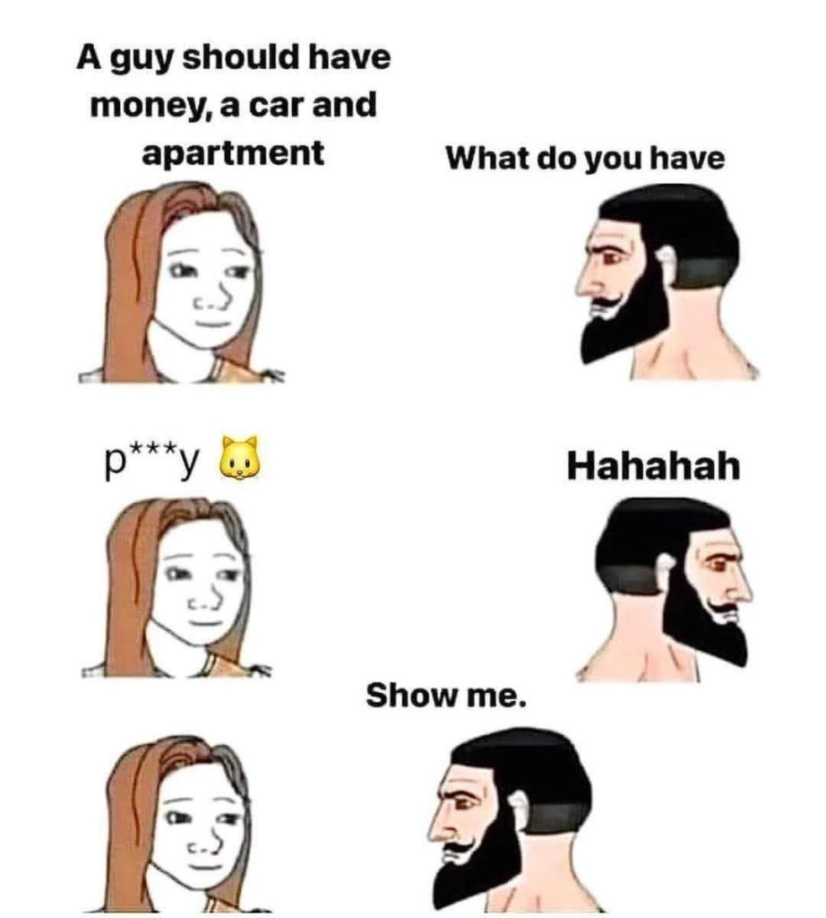 O cara se convence de um monte de crença derrotista e limitante e fica propagando isso como se fosse a maior verdadeVira homem filho da puta, porra de blackpill