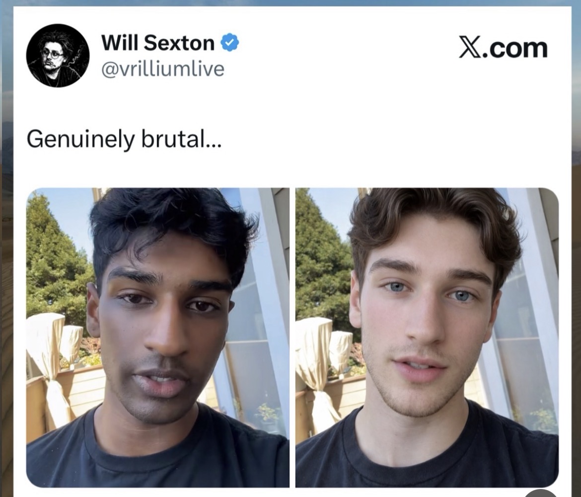 >>220273527guy on the left is edited to have thinner neck, larger lips, eyes and nose. Also ears made larger. This is not edit made of only skintone and hair color. Made by a racist coping