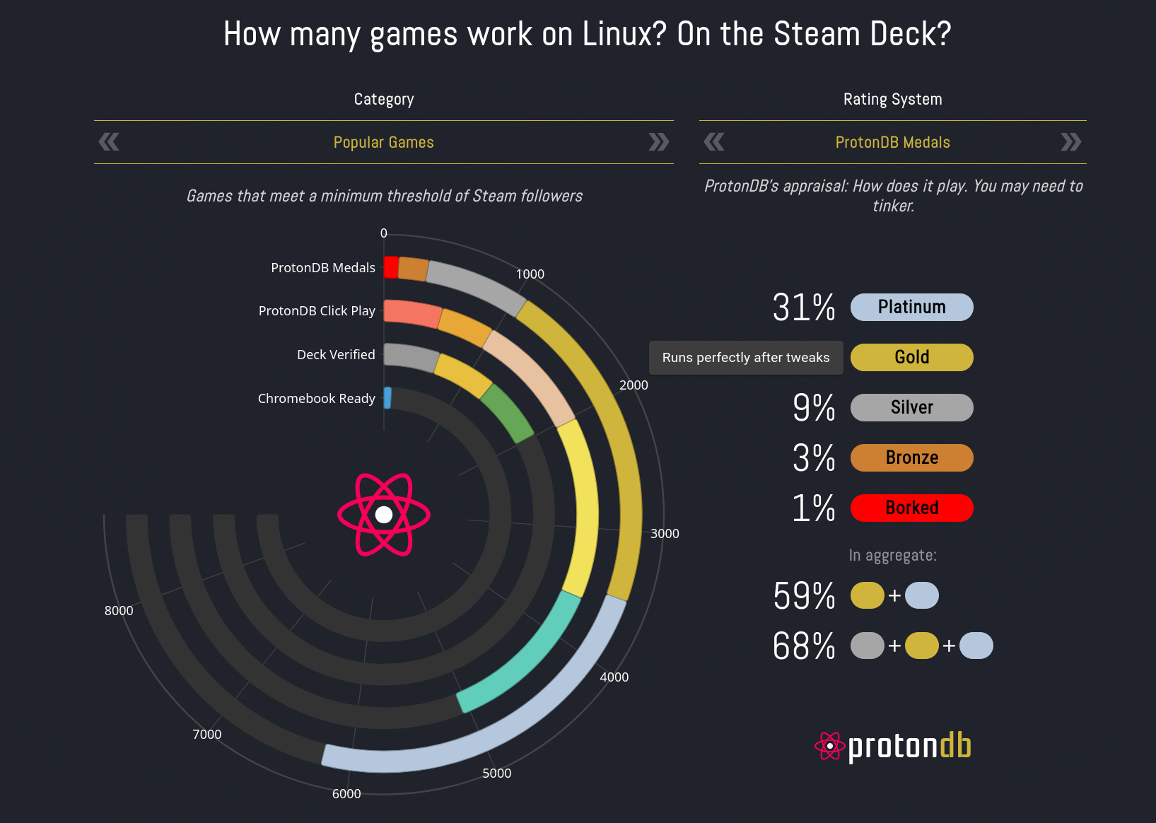 >>220345454>>220345352I fucked up my statistics, this 72% tested is for "popular games" whatever the fuck that means; the total fraction of the steam catalog tested is like 12-13%but for most older games using common game engines, if one of them works all of them will work