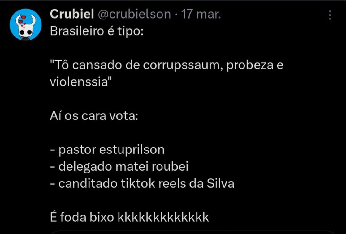 A verdade é que com Lula, Bolsonaro ou Renan Santos, o Brasil continua a mesma montanha de bosta. O que o Brasil precisa é do /bra/ e de cada membro dele.Eu vou propor um partido político do /bra/ na Câmara dos Deputados amanhã mesmo. Todos unidos nessa causa.