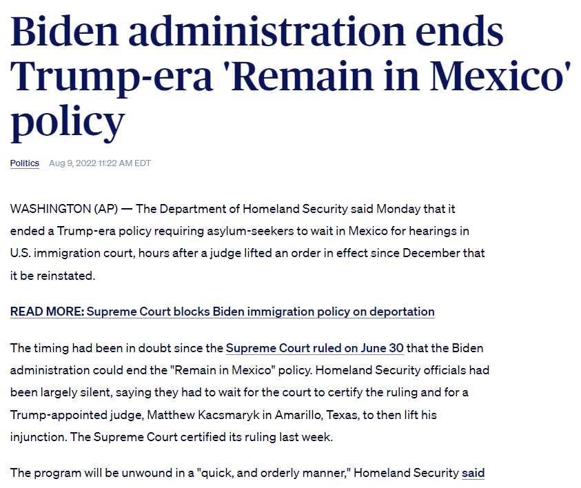 >>220283553>Biden had a policy where they'd remain in Mexico pending their caseYou mean the Trump policy that Biden ended? LOL