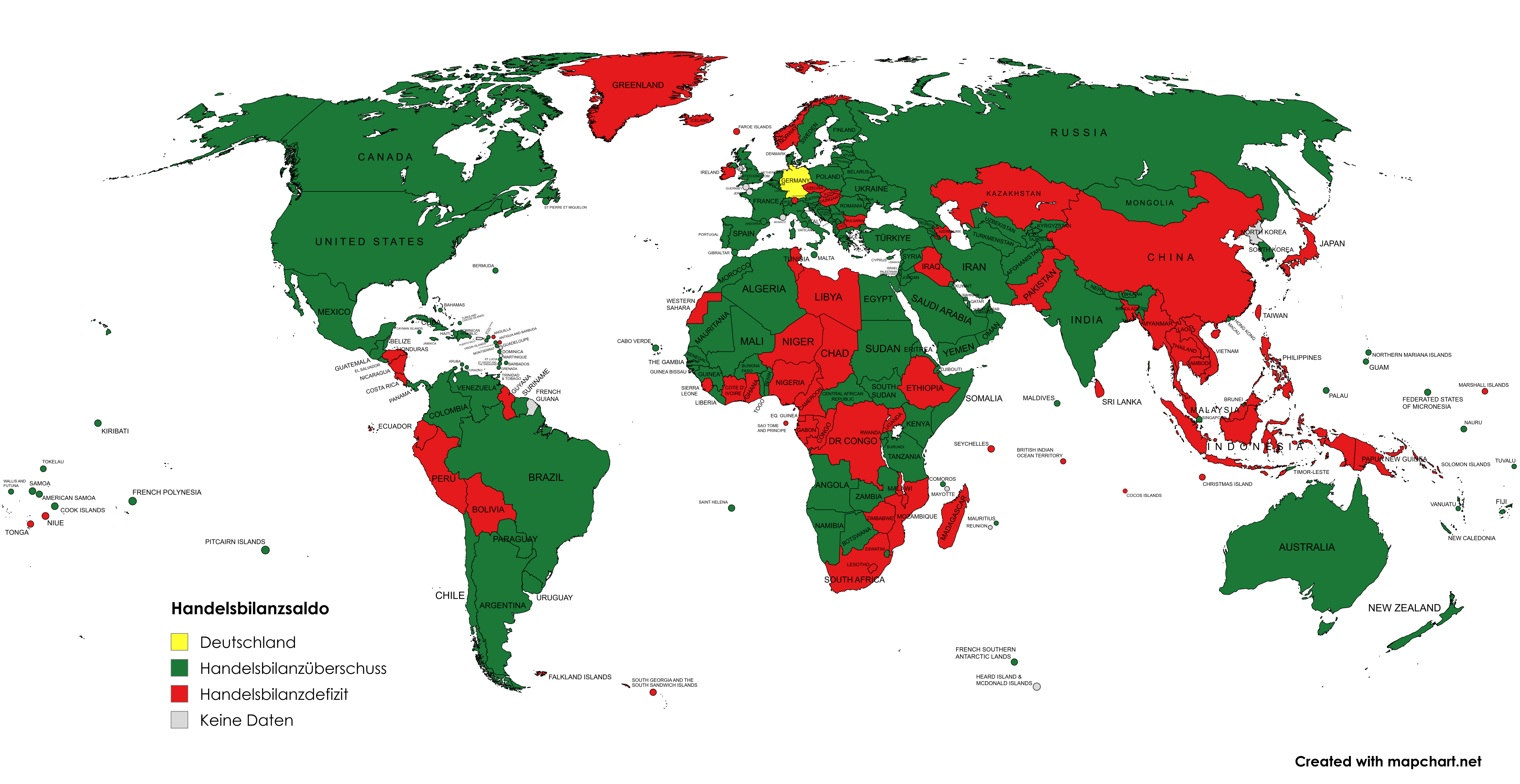 Green = Germany has a trade surplus with than countryRed = German has a trade deficit with that countryGrey = No dataAfter WW2, Germany constructed another empire, this time an empire of trade