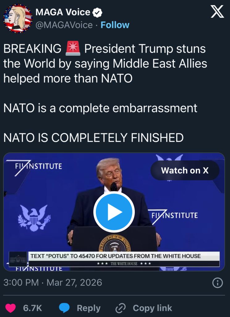 >>220310274why should we join yet another US/israeli (same thing at this point) war in the middle east? Trump wants to leave NATO anyway so why bitch and scream most European countries are reluctant to die for Israel. we haven't forgotten Afghanistan and Iraq (WMD, but this time for real!!)you started it, you finish it. take some responsibility for your own actions, especially when you have the gal to play world police >"I am especially proud to be the first President in decades who has started no new wars"t. trump. i wonder if he actually believes his own lies. you voted this clown into office not once but twicemilitary spending is the only valid criticism, but we're getting there. mainly because the US is acting more and more like a rabid dog you can't trust in any way