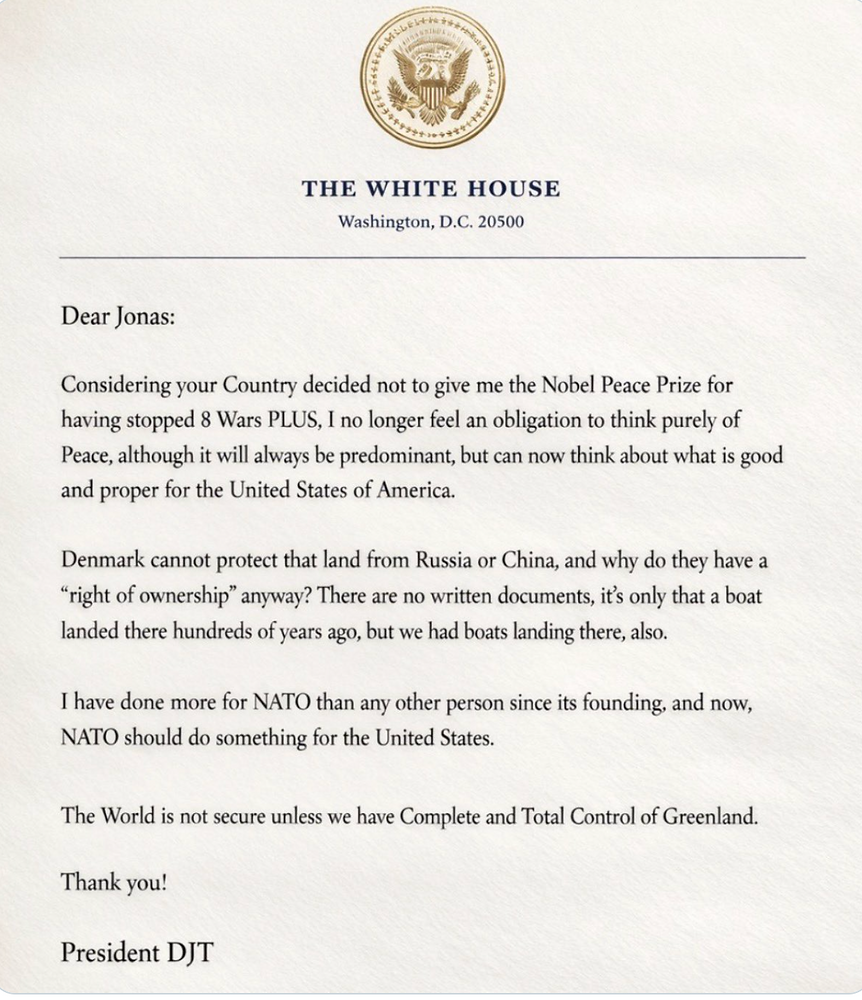 >>220311145>you didn't give me the noble peace prize so i'm no longer obliged to think purely of peace>"the world is not secure unless we have complete and total control of Greenland">threatens with extra tariffs for countries that stand by denmark and greenland>akhtually he didn't consider military force, eventuallyhow are we supposed to interpret this? and when did a European country threaten with the annexation of US territories?