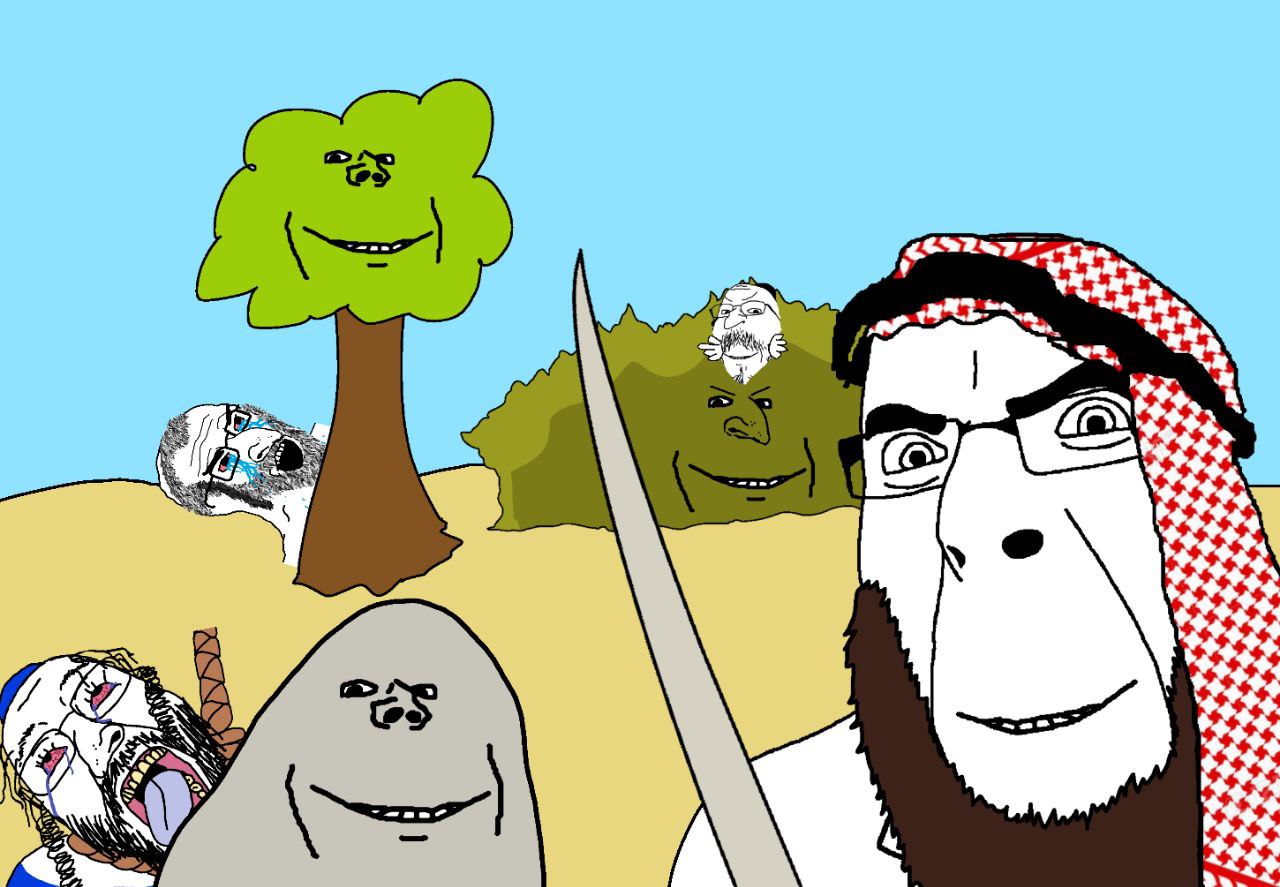 >The last hour would not come unless the Muslims will fight against the Jews and the Muslims would kill them until the Jews would hide themselves behind a stone or a tree and a stone or a tree would say: Muslim, or the servant of Allah, there is a Jew behind me; come and kill him; but the tree Gharqad would not say, for it is the tree of the Jews.