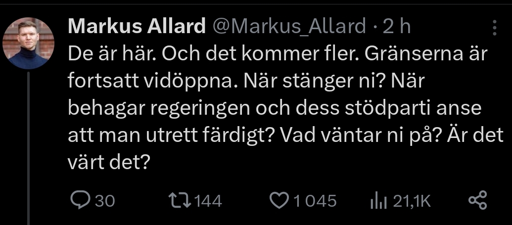 >>220330720Det är svenskarnas framtid det handlar om detta är ingen lek där man sömnigt upprepar samma gamla vallöften och inte levererar.Svensk politik behöver hård retorik och handlingskraft istället för sömniga utredningar och tomma ord.