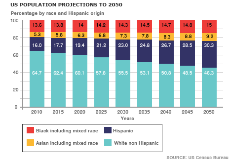 In the United States, non-whites will become the majority by 2045, and Hispanics will become the largest ethnic group by 2080.