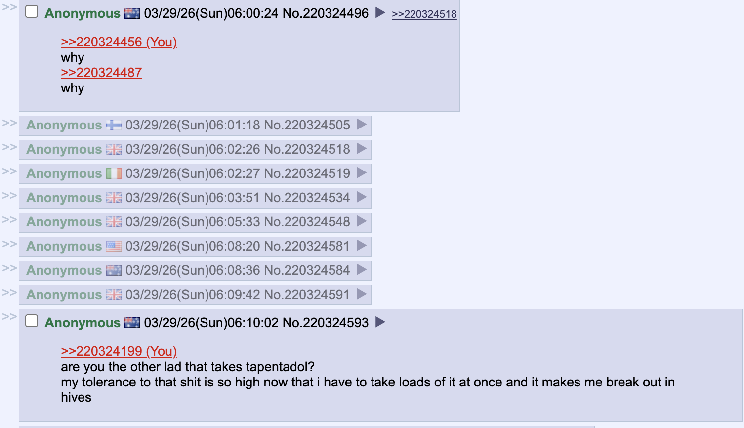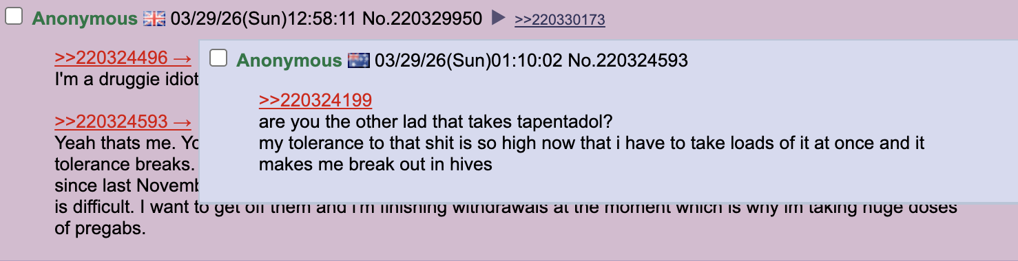 It was over Christmas. I'd been incrementally increasing my habit since November when I bought that outrageous stock direct from India. By December I was taking 200mg when I woke up, or id quickly go into withdrawals. By the time I spent a week with family at Christmas it was 200mg when I woke up. 200mg 2 hours later. That would do me for 4 hours but id take another 200mg then as a precautionary. Then another 200mg 4 hours later. 400mg then and another 200mg right before bed. It was insane. I'd struggle to have any appetite which isn't a good luck over Christmas. Honestly it was fortunate my grandad took ill and my alchie auntie caused chaos or family would surely have noticed. I think redditors tell people you can have a seizure over 500mg, but thats only if you have no tolerance and it builds quick. I managed to cap it at 1200mg and wean for a week or so in January before doing withdrawals. My taps addiction hasn't gotten so bad again since but I had to do a weeks withdrawals in Feb and ive already done a week at the start of march and now another 5 days. Hopefully this tolerance break lasts longer than the last. I do not like taking taps at work. I could easily go to prison for my habit.