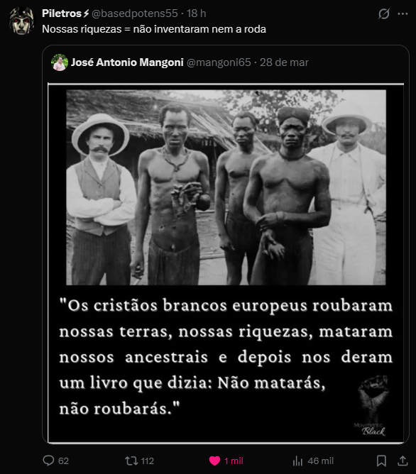 Não sou racista, mas eu não ironicamente nunca vi um exemplo de desenvolvimento humano pleno em uma sociedade sob a tutela de negrosUm exemplo que vários ativistas afro utilizam é o da Black Wall Street, mas tudo que eles haviam conseguido antes do ataque da KKK era oferecer a versão black de serviços financeiros que já existiam na sociedade branca há séculos. Literalmente.