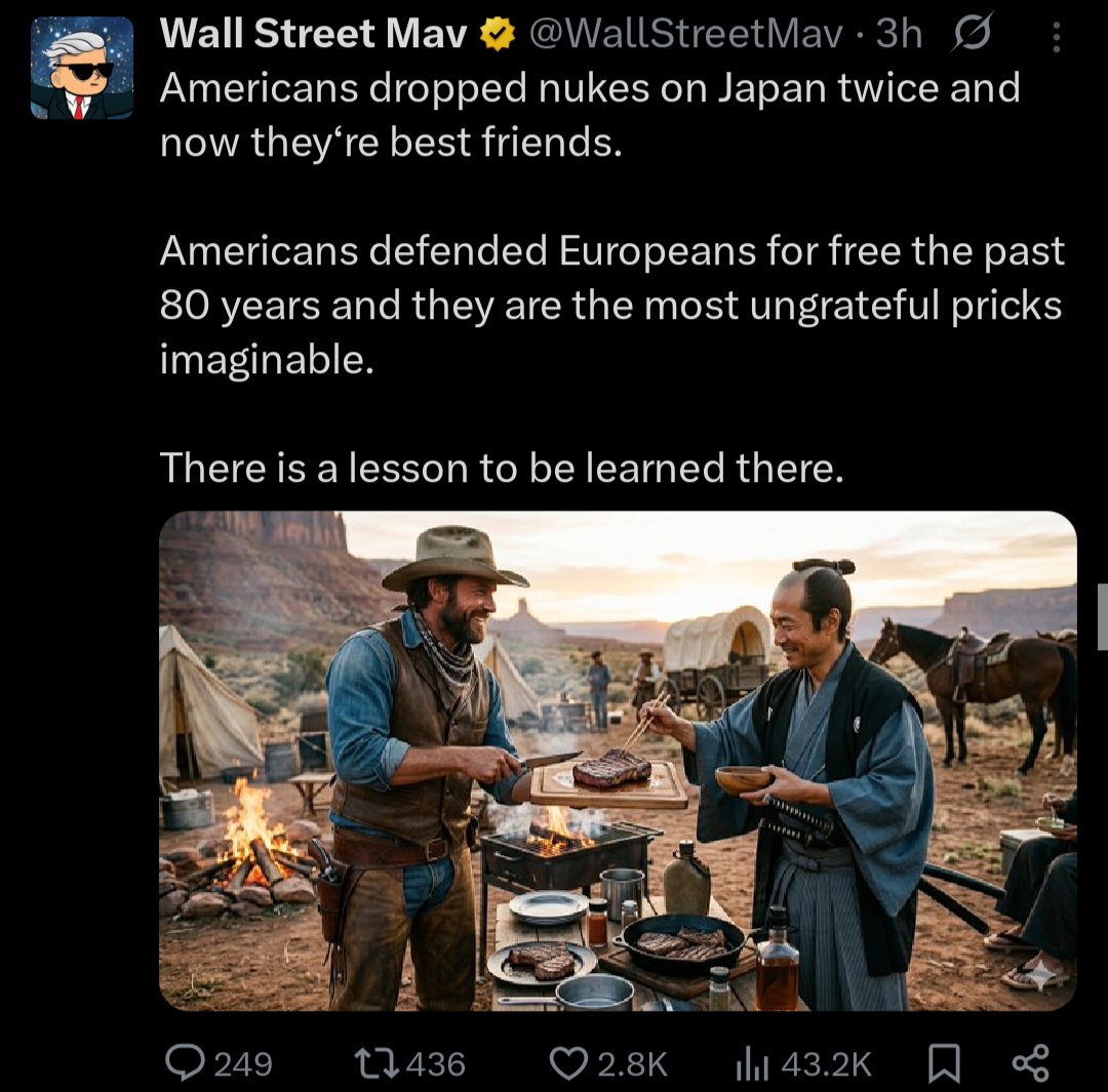 >>220344316>overthrew gaddafi>overthrew Assad >just kidnapped maduro>closest we've ever been with the GCC who are all backing us in Iran >japan just elected very pro US leader >Russia is being contained pretty hard because of our fuckery in Iran and Venezuela and the ousting of Assad not to mention the war with Ukraine tying them up >europe more reliant on our LNG than ever 2 more weeks USA gonna collapse any day now lol. People have been saying we are gonna collapse any day now since literally the founding of the nation. If we csn tank the civil war and still remain an imperial power afterwards I think we'll be fine with bombing Iran with the support of most of its neighbors. Even Pakistan is helping us lmao. Really the only guys we have to worry about is China