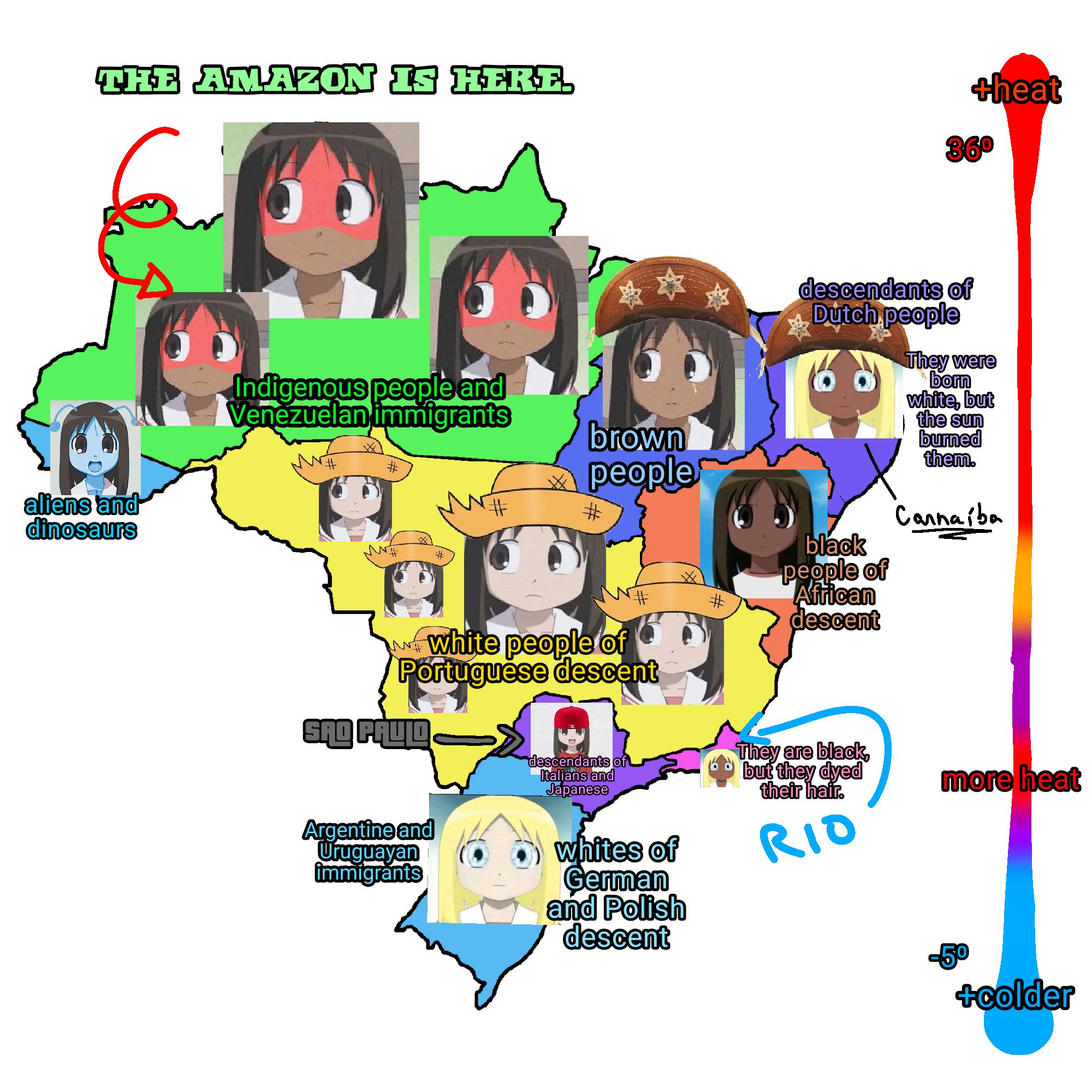 >>220338725How I see it as an American:>NorthKurumihna-Portuguese Mestizos. There's dinosaurs and ooga booga tribals that eat people here.>NorthwestBLACKED: the region. Also used to be Muslim for some reason>Sao Paulo areaCore part of Brazil. Where Caipiras live. Where all Brazilian stereotypes come from. Everyone seethes at them. This and the Amazon are the only parts foreigners visit. >South BrazilItalian-German-Portuguese mixes who are chuds. It's basically north Argentina. Seethes at Paulistas really hard.>Central-WestNobody lives here. Brazil's Midwest. There's farms, i guess.