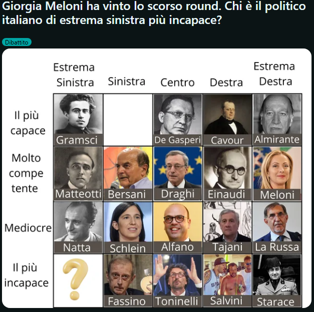 >>220342839>meloni>estrema destra>molto competenteoh SANTO reddit