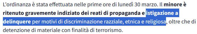>>220351263>Le indagini hanno altresì documentato i contatti tra il minore e il vertice del gruppo Telegram denominato “Werwolf Division”, incentrato su contenuti e narrazioni legati alla supposta superiorità della “razza ariana”, nonché sulla costante glorificazione di mass shooters quali Brenton Tarrant, autore degli attentati alle moschee di Christchurch avvenuti il 15.03.2019, e Anders Behring Breivik, autore degli attentati avvenuti a Oslo e Utoya il 22.11.2011, elevati a “santi” per incentivare l’emulazione.