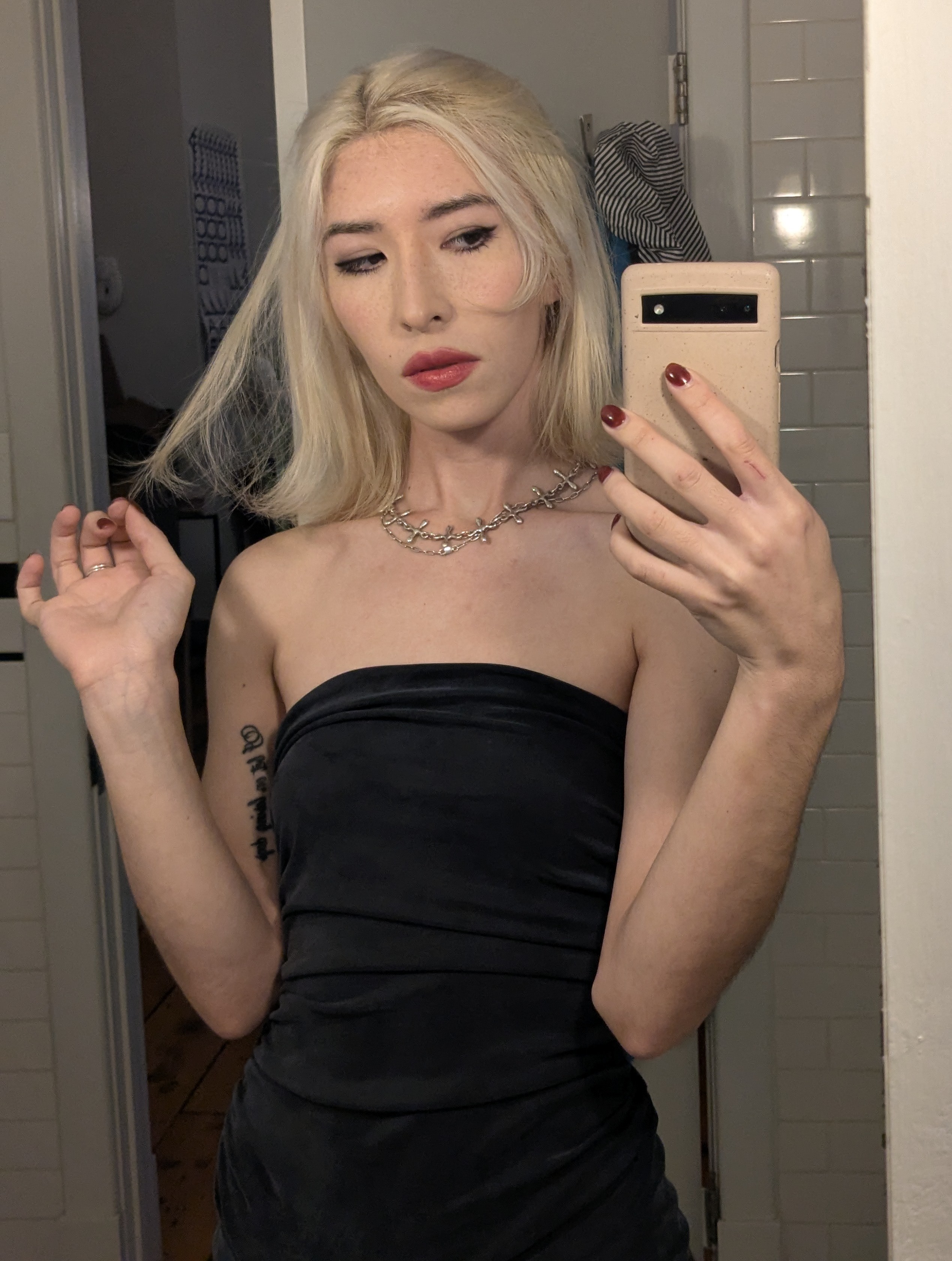 >>220355982I don't even think he's on HRT, his arms are too hairy, tits to small and face too masculine although still pretty feminine overall. I think he just donned a dress, done a makeup, put some lipstick and nail polish and called it a day.