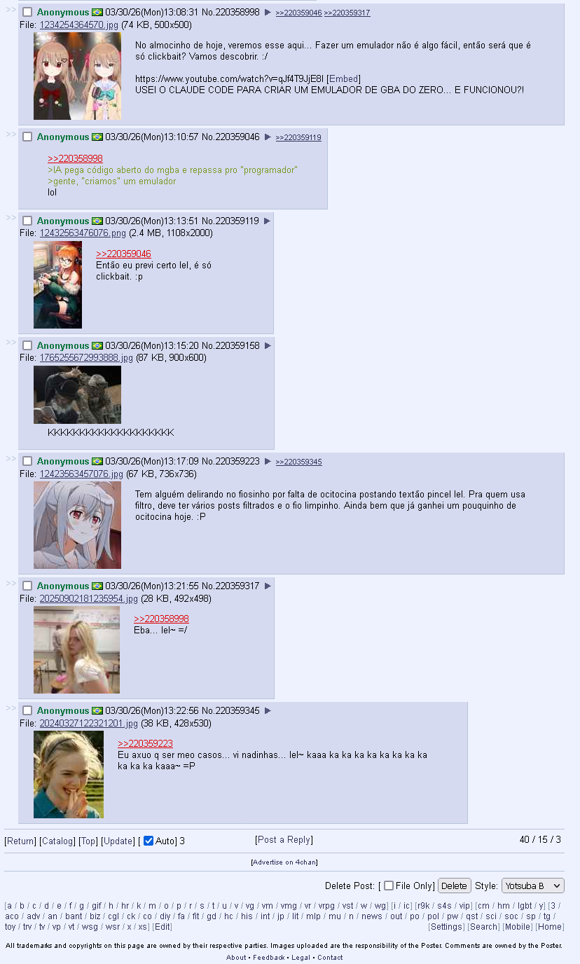 No almocinho de hoje, veremos esse aqui... Fazer um emulador não é algo fácil, então será que é só clickbait? Vamos descobrir. :/https://www.youtube.com/watch?v=qJf4T9JjE8IUSEI O CLAUDE CODE PARA CRIAR UM EMULADOR DE GBA DO ZERO... E FUNCIONOU?!