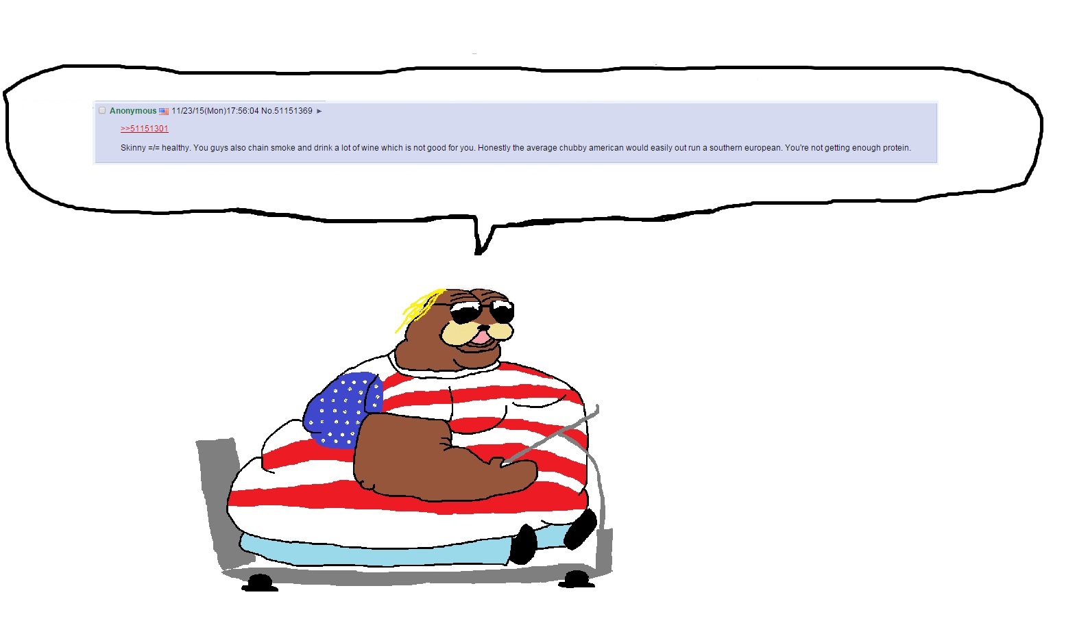 >>220360415shite glasses, belly protruding (very disrespectful), nappy undoubtedly shat