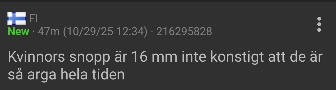 Om en kvinna har små bröst så är du porrskadad om du gillar stora bröst men om hon har stora bröst så är du pedofil om du gillar små bröst, är hon tjock så har du av media influerade och orealistiska skönhetsideal om du gillar smalare tjejer men är hon smal så är du desperat/porrskadad om du gillar rundare tjejer, är hon äldre så är du pedofil om du gillar yngre tjejer men om hon är yngre så har du nån porrskadad milffantasi om du gillar äldre kvinnor, om hon är vit och du gillar mörkare tjejer så har du en rasistisk och exotifierande kolonialisttendens men om hon är mörk och du gillar nordiska kvinnor så har du en ogranskad rasism i ditt DNA som du måste ta itu med *ANDAS* Om hon är korkad och du gillar smarta tjejer så är du pretentiös och idiotförklarar kvinnor för att du har en ogranskad manlig blick men om hon är smart och du säger att intelligens inte är allt i en kvinna så vill du bara ha ett följsamt våp för att du känner dig hotad av kvinnlig intelligens osv. osv. osv. osv.inse bara att kvinnor kan komma på vilken jävla ursäkt som helst för att gnälla, det är det enda konstanta genom historien, inget provocerar dem mer än när du attraheras av något som de inte har