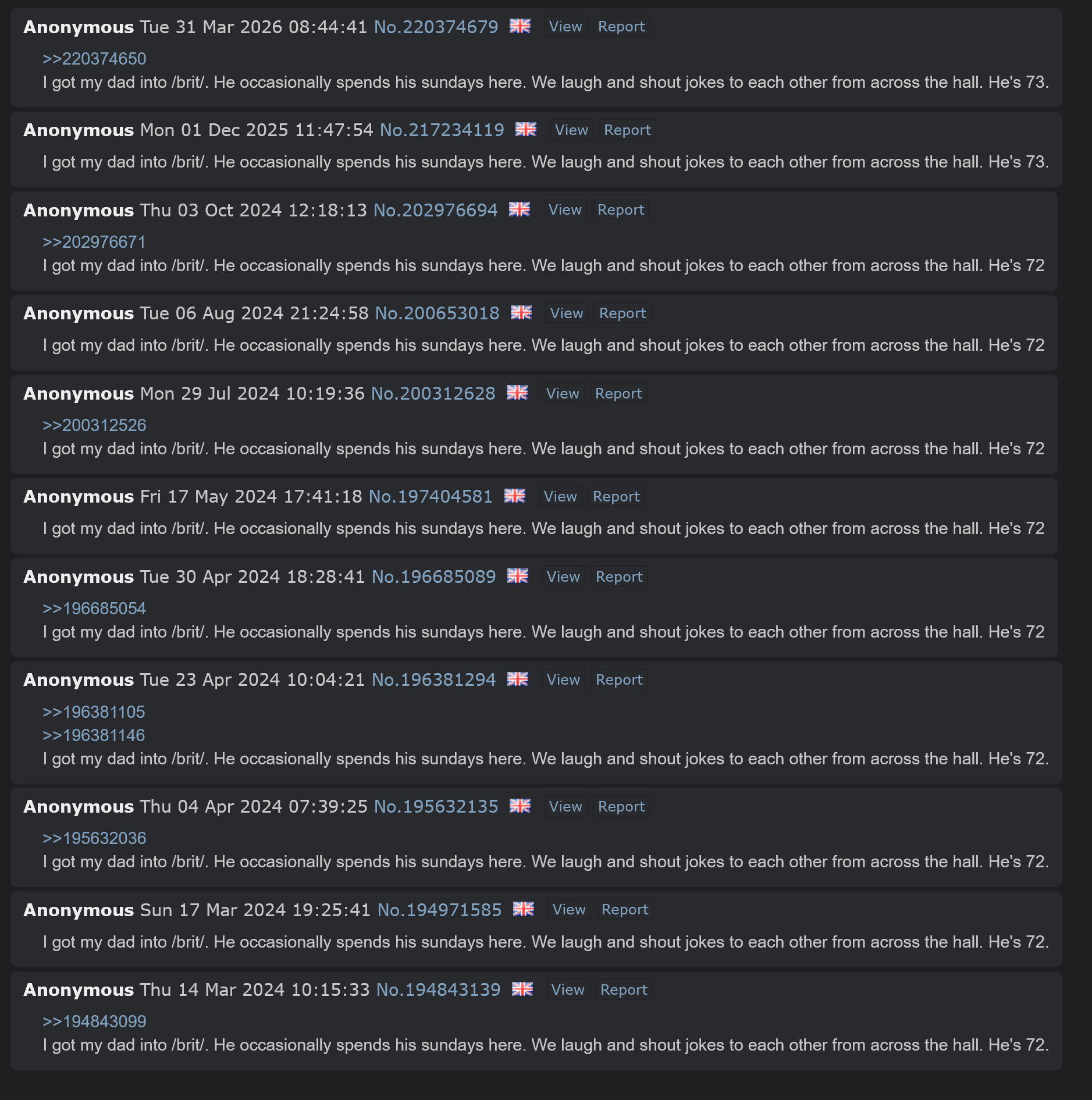 >>220374650I got my dad into /brit/. He occasionally spends his sundays here. We laugh and shout jokes to each other from across the hall. He's 73.