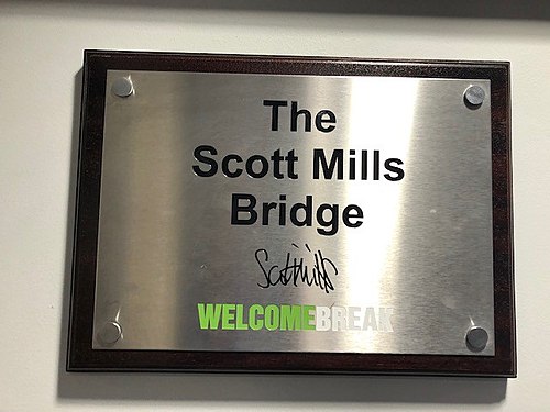 >On 16 March 2016, the bridge crossing the M3 at Fleet services was officially named the Scott Mills Bridge and a plaque unveiledthe nonce bridge
