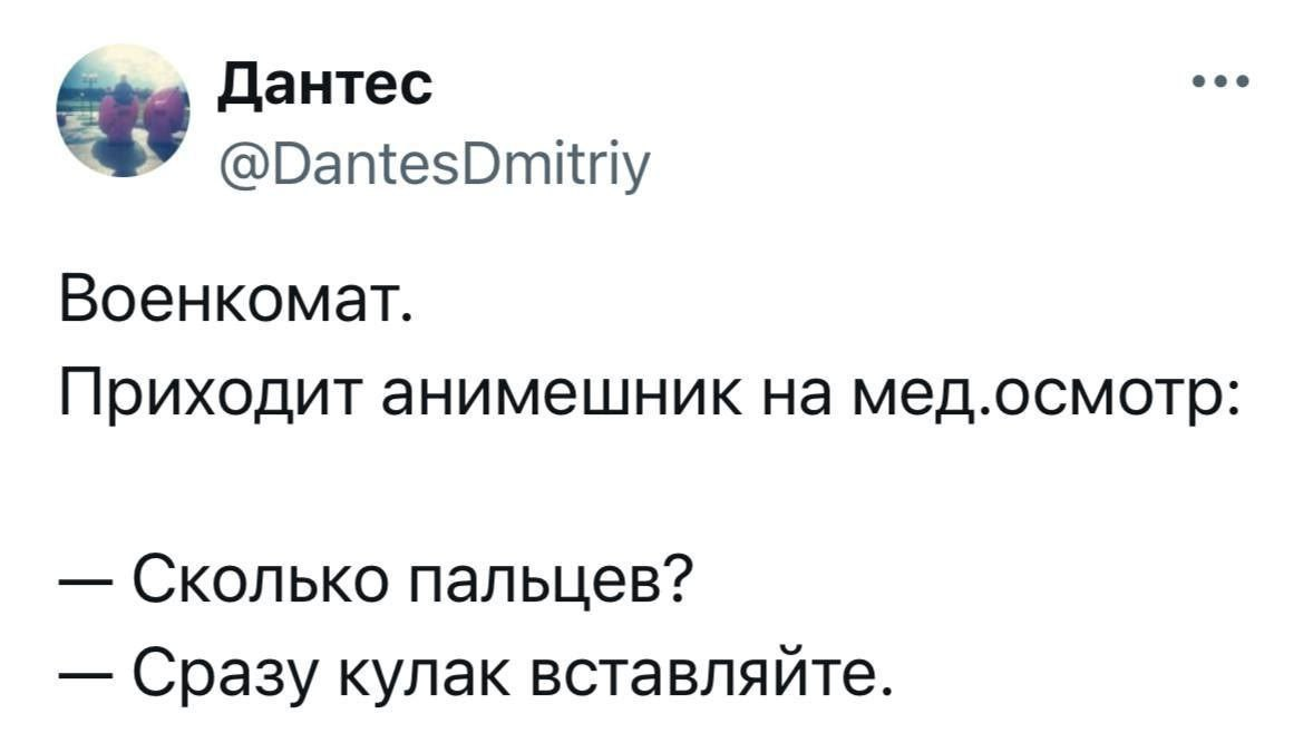 Boeнкoмaт.Пpихoдит пpoгpaммиcт нa мeд.ocмoтp.— Cкoлькo пaльцeв?— дeдyля гaзy apy c тя нaх