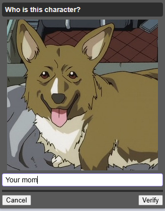 >>220401639I've got kyubey once, but typed kyubei, because I didn't know how to write it in English. It told me that I've mistyped the captcha...