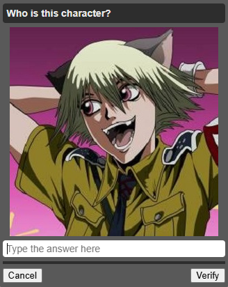 Confesso que esse capthca me pegou eu passei uns 5 minutos procurando o nome do personagem de anime.