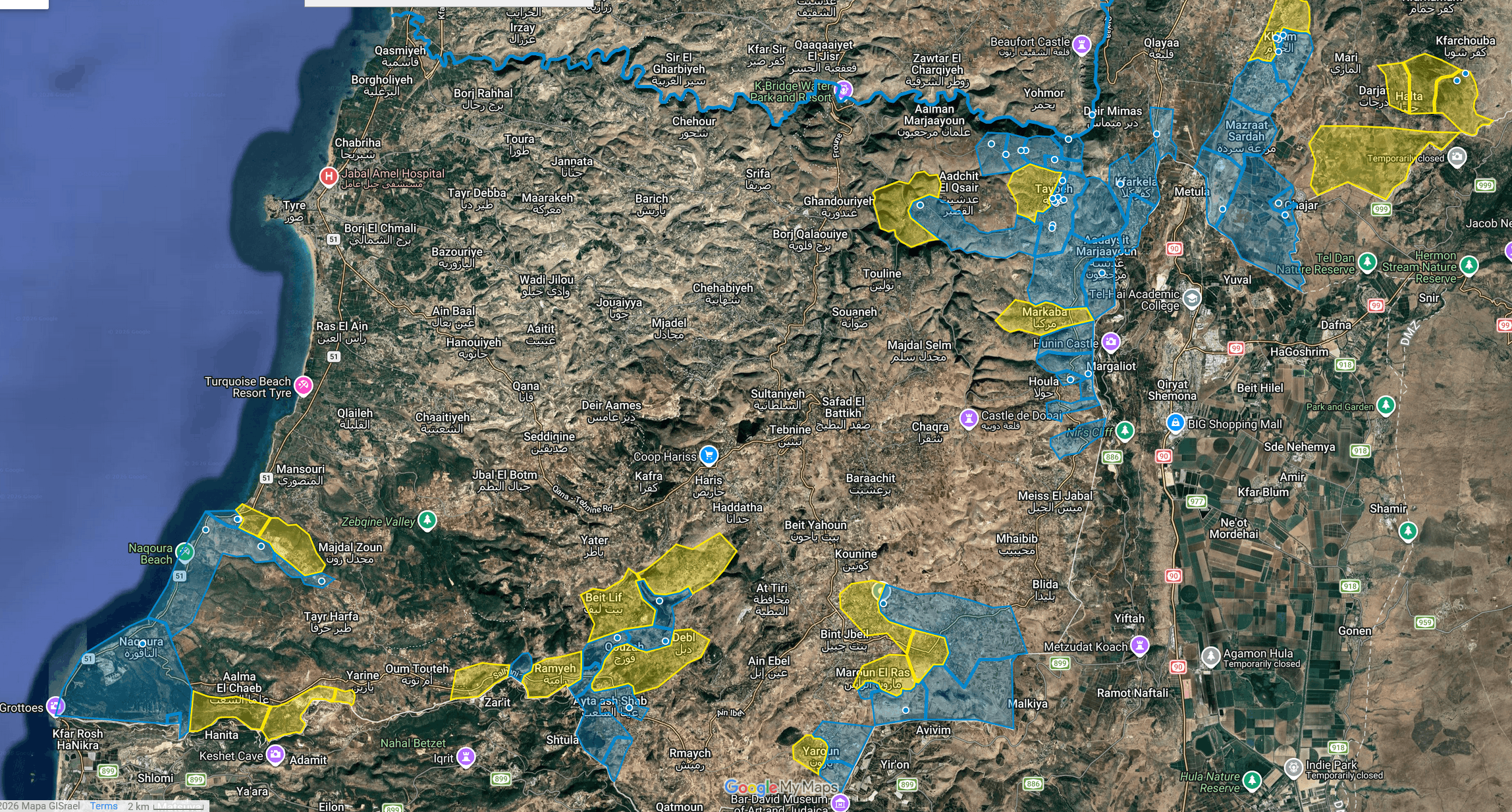 עדכון על התמרון בלבנון, שני באפריל 2026:>חזית קו החוףכוחות צה"ל מחזקים את עמדותיהם לאורך קו החוף, עם דיווחים על הריסת כבישים ומבנים בנקורה, אותה כבשו.חיזבאללה ממשיך לתקוף עמדות ישראליות בביאדה ובשמעה לפי טענתם, אך התקפות אלו הן בעזרת אמצעים ארוכי טווח כגון רחפנים ומרגמות, מה שמראה שאין נוכחות חיזבאללה יותר בכפרים אלו מטרות: שליטה על נקודות שולטות בגבהות>חזית המרכזנראה כי כוחות צה"ל מכוונים לכתר את בינת ג'ביל, העיר המרכזית במחוזכוחות צה"ל מתקדמים בשתי חזיתות במחוז. ממערב, הם דוחפים מקאווזה לכיוון דיביל - שם פוצצו בתים בפאתי העיר ביום רביעי - ולכיוון רשף. בבית ליף נראה כי כבר הושגה שליטה מלאהממזרח, נרשמו עימותים בין כוחות חיזבאללה לצה"ל בעיינתא. נראה כי כוחות ישראליים נחושים לכבוש את גבעת פריז, המשקיפה על האזור.מטרות: כיתור בינת ג'בייל וכיבושה, כיבוש יאטר מצפון לבית ליף, עיר על גבעה ונקודה נוחה לירי נ"ט של חיזבאללה>חזית המזרח\אצבע הגלילכוחות צה"ל ממשיך לדחוף מזרחה, בדיר סיאן אשר על הליטני נרשמה שליטה מלאה והכפר שוטח לאחר פיצוץ ידני של מבנים ע"י כוחות צה"ל, מה שמראה על שליטה מלאה, מנגד, חיזבאללה טוען שכוחותיו תוקפים את כוחות צה"ל בכפר קנטרה, אשר נמצא בשליטה ישראלית, דיווחים מצביעים שצה"ל החל לנוע עמוק יותר לאורך קו הליטני קוסייר, ח'יאם נמצא בשליטה מלאה של צה"ל למרות דיווחי חיזבאללה על פתיחת מתקפת נגד בצפון העיירהמטרות: התקדמות לאורך קו הליטני, אפשרי גם התקדמות צפונה אל דרום בקאע מקור: עיתון לאוריינט הלבנוני