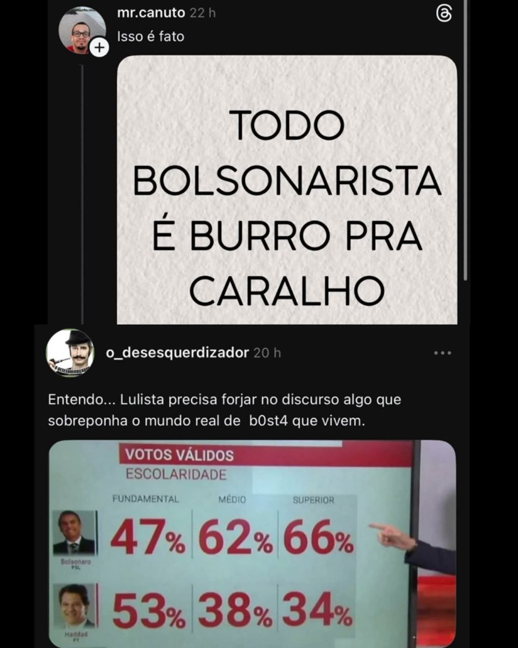 Estou começando a suspeitar que é o mesmo indivíduo alternando entre fazer spam de meme redpill de direita e esses memes petistas