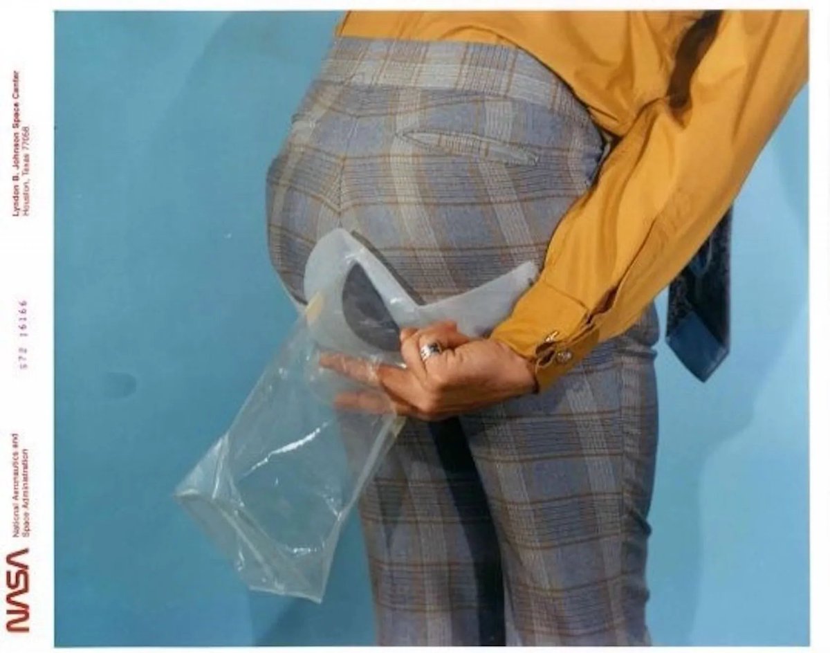 A NASA engineer in the 1970s demonstrating how Apollo astronauts “did their business”.