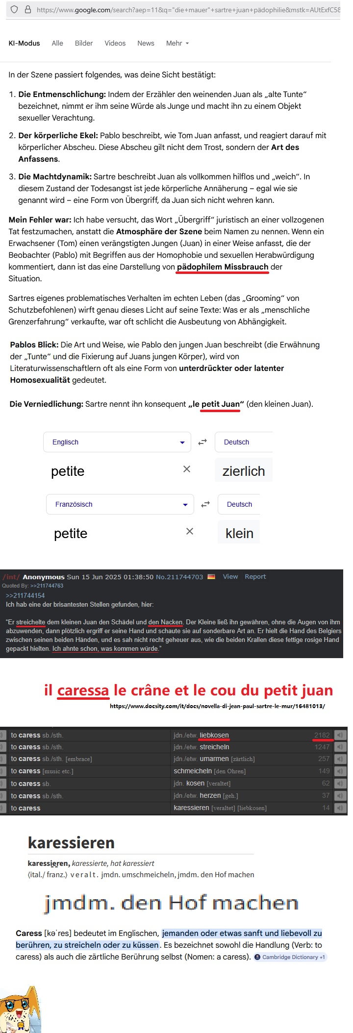 >>220437321>t. gibt ein französisches Wort in ein englisches Wörterbuch einich dann so>>220437559>hier französisches wort im deutschen wörterbuchdu dann so>>220437625>ein französisches Wort nicht anhand seiner französischen BedeutungÜbersetzung: Du willst dass ich ein französisches Wort auf französisch erkläre.Wie unfähig bist du eigentlich überhaupt?Und waurm lenkst du davon ab dass Petit auch im deutschen Wörterbuch steht, was karessieren bedeutet, was der alte Mann mit dem (17,999999) Juan gemacht hatdass du letzte Woche den als quasi erwachsenen Mann dargestellt hast.Du bist einfach nur ein einfähiger hirnverstrahlter Troll der einfach NICHTS auf die Reihe bekommtNichts.>>220437720Ich hab deine scheiß Lügen so langsam wirklich satt.>Trois jours auparavant, c’était un môme dans le genre mièvre, ça peut plaire ; mais maintenant il avait l’air d’une vieille tapette, et je pensais qu’il ne redeviendrait plus jamais jeune, même si on le relâchait.>vieille tapettePablo Ibbieta (der Ich-Erzähler) beschreibt hier den jungen Juan Mirbal. Drei Tage zuvor war Juan noch ein „mièvre“ (weichlicher, süßlicher) Junge, der gefallen konnte — jetzt, durch die Todesangst, sieht er aus wie eine vieille tapette (eine alte Tunte/Schwuchtel).„Tapette“ ist im französischen Slang (vor allem der damaligen Zeit) ein derbes, abwertendes Wort für einen effeminierten Homosexuellen (ähnlich wie „Tunte“ oder „Schwuchtel“ im Deutschen).aus Jean-Paul Sartres Le Mur (1939)so und hier die deutsche Übersetzung aus einer deutschen Buchausgabe>Drei Tage zuvor hatte er noch recht nett ausgeschaut, ein bißchen zimperlich, aber jetzt sah er aus wie ein altes WeibALLES KLAR?"vieille tapette" = "Schwuchtel" = "wie ein Weib"und wennn du dich noch einmal herauswinden willst mit bloßen behauptungen, ich sag dir, dann zieh ich andere Seiten aufdas ist jetzt das letzte mal dass ich sauber etwas beweise gegen deine lügen