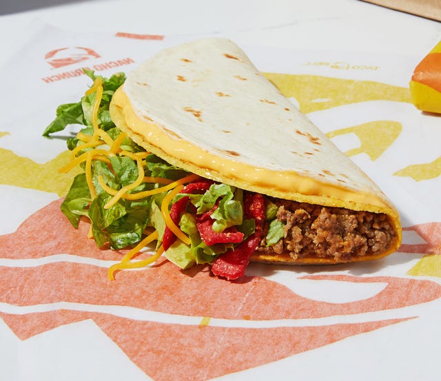 I like the double stacked tacos. They're like normal tacos with flaming hot Doritos for crunch and a flour tortilla glued to hard shell with queso. It's very Mexican.