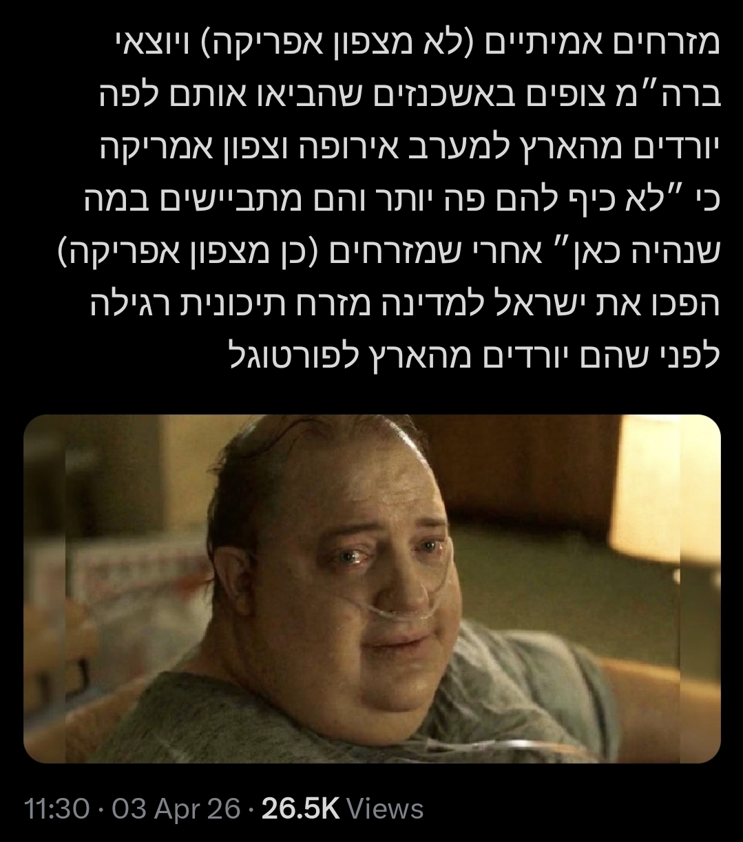 >>220488361"אם האשכנזים היו שמחים יותר והיו עושים סקס כדי להביא ילדים, ולא סתם בשביל ההדוניזם – הייתם חוזרים לגדולה שהייתה לכם בשנות ה-60 וה-70.להיות 'צ'וד' לא הולך לעזור לכם. אתם בסכנת הכחדה, במיוחד החילונים שביניכם.אתם צריכים לעשות ילדים כמו הערבים.הדמוגרפיה שלכם גוססת, ואני אומר את זה כמישהו שרוצה לראות את האשכנזים מצליחים