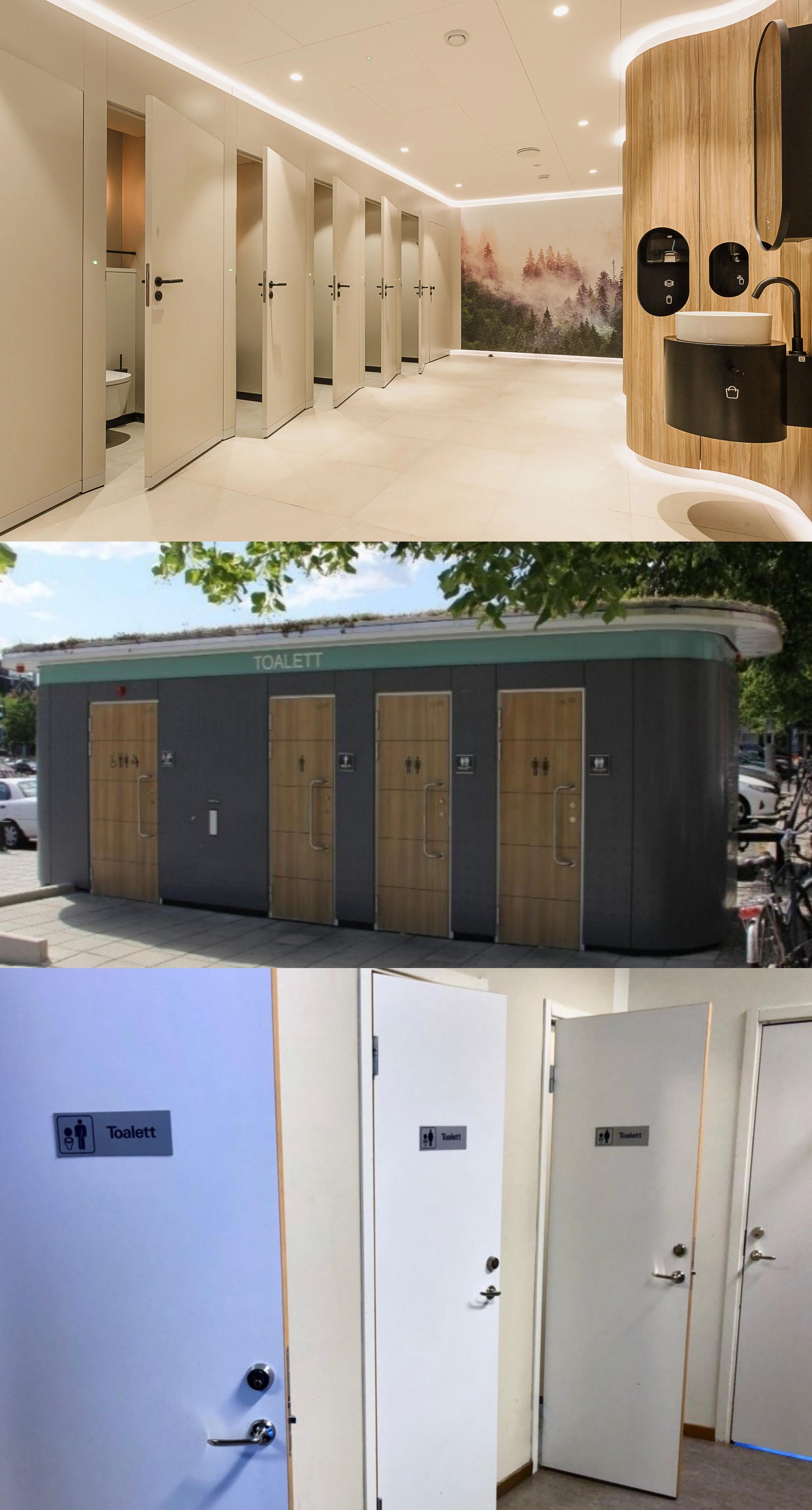 >>220481163>What do euro stalls look like?Depends on the country. I have never seen toilet booths here in Sweden. Public bathrooms are just separate little bathrooms next to each other, same with big public ones like in malls. Top pic is Mall Of Scandinavia just down the street from me. Middle pic is a public street toilet. Bottom is the bathrooms in my kid brothers school.