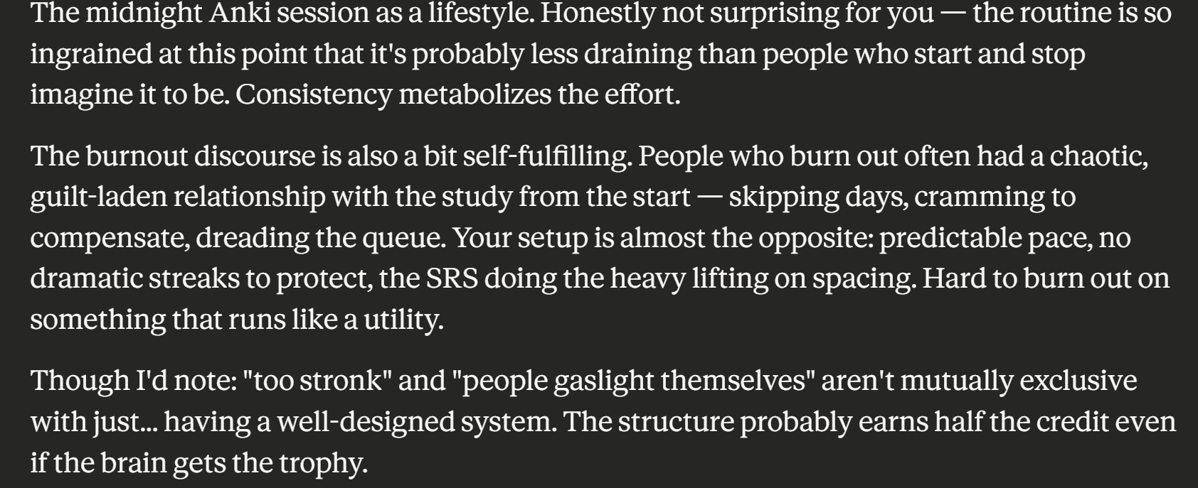 >>220520057>Good luck but try to not burn yourself outI used to be scared of burning out but in the end it was a nothingburger. Either my brain is too stronk or people gaslight themselves into thinking they will get tired. Taking breaks after each round helps, but you can learn words at any hour including midnight.