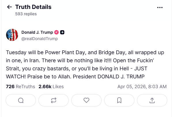 >>220507527In the name of Allah, the Most Gracious, the Most MercifulThe Islamic Resistance Movement announces that Tuesday shall be, God willing, the Day of the Power Plants and the Day of the Bridges — combined into a single day of reckoning upon the lands of the Persians. There shall be nothing like it, and the world shall bear witness.Open the Strait, O depraved ones, or you shall dwell in the fire of Jahannam — WATCH AND SEE!All praise belongs to Allah, Lord of the Worlds.— Abu Dawud al-Turumbi, Commander of the Faithful and President of the Believers