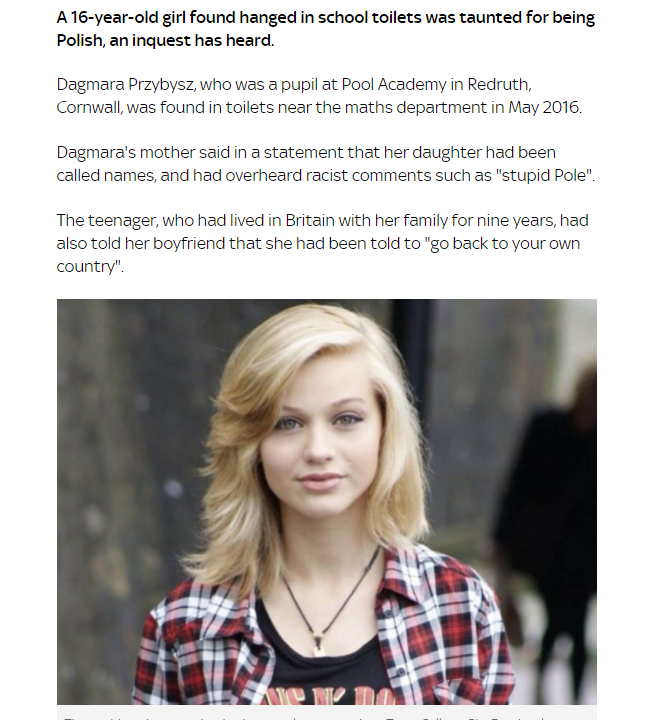 >>220516574>CornwallThey're weirdo country-bumpkins and Celtic nationalists. A Pole was probably the most exotic thing they'd ever seen at their school.She'd have been treated normally if she lived in suburban London or the home counties.