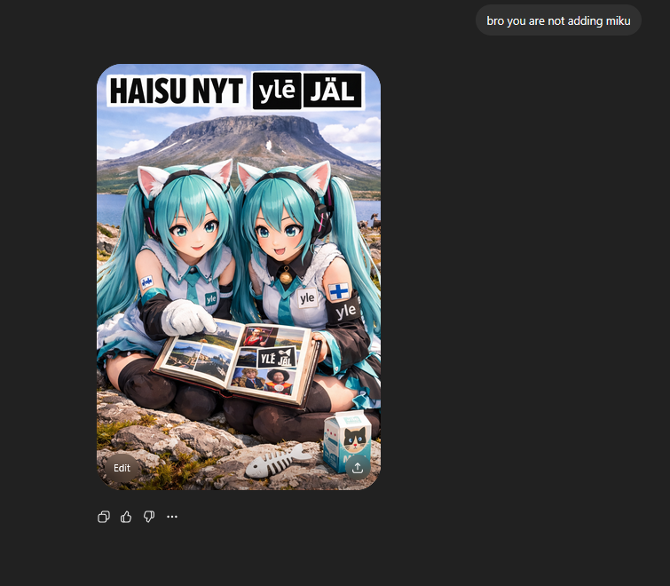 >>220517203siinä voi olla mikun värit muttei silleen pelkkä miku>>220517236joo ja ismo mukaa