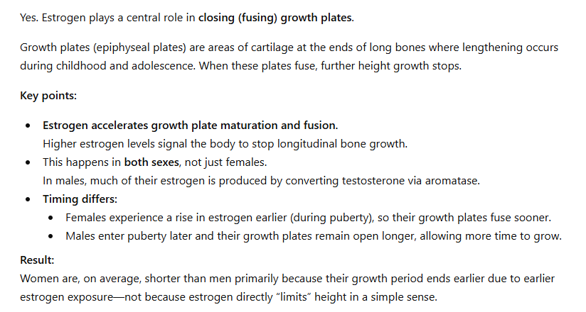 >>220523582No, retard. Estrogen causes growth plates to fuse earlier, it's the mechanism that makes women shorter than men.