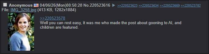 >>220526242Bold of you to show your face again after you publicly admitted being a pedo earlier.