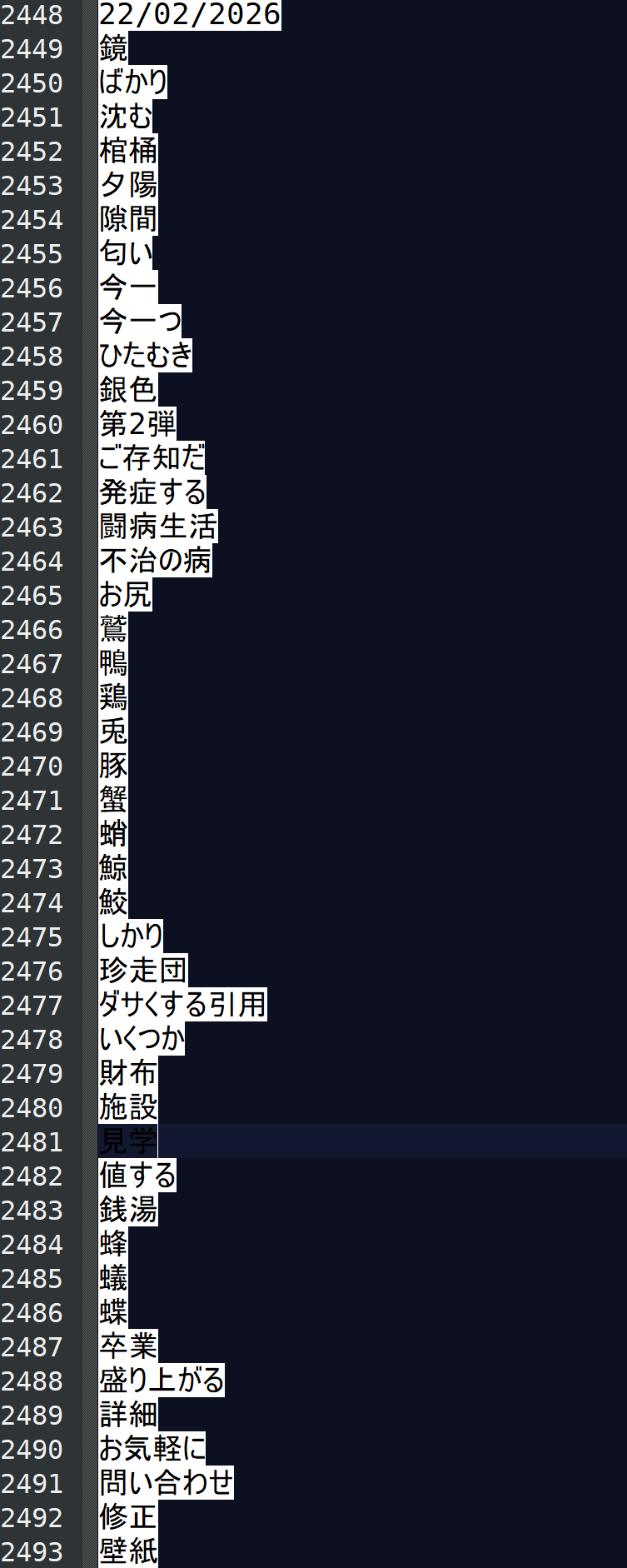 >>220543037I went back to a couple of months ago and did what you said. I can recall nearly all of these words except 2 or 3. They're animal names so their frequency isn't high either. If I went all the way back it would probably take me a couple of days to review all the missing words.