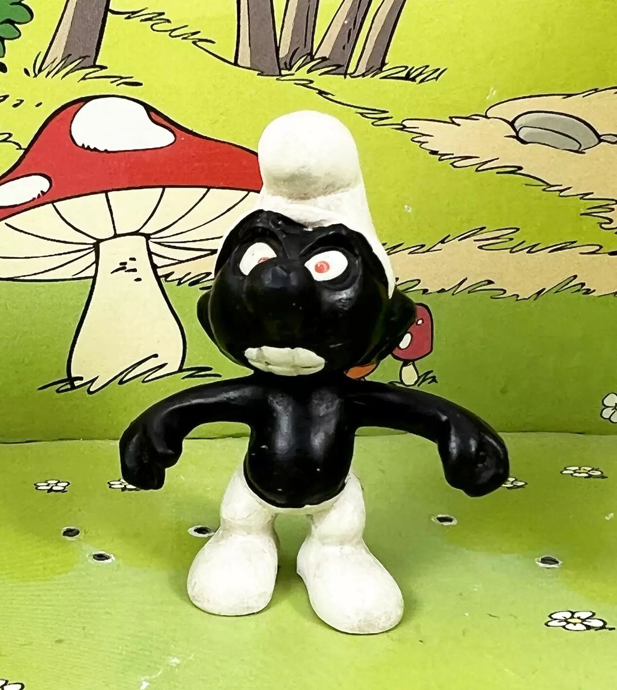 >>220544297This item is a vintage "Angry Black Smurf" figurine produced by Schleich and Peyo, originally released around 1966.Model Number: 20007.Unique Features: This version is rare due to its black body, distinctive red eyes, and white or black teeth.Origin: Made in West Germany.