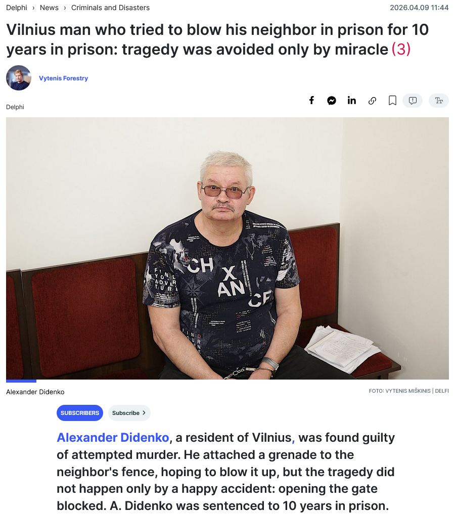 a sequel to one of my favorite wilno slavshit tranimes>Aleksandras Didenko, a resident of Vilnius, has been found guilty of attempted murder. He attached a grenade to his neighbor’s fence, hoping to detonate it, but tragedy was averted only by a lucky coincidence: the gate jammed as it opened. Didenko was sentenced to 10 years in prison.