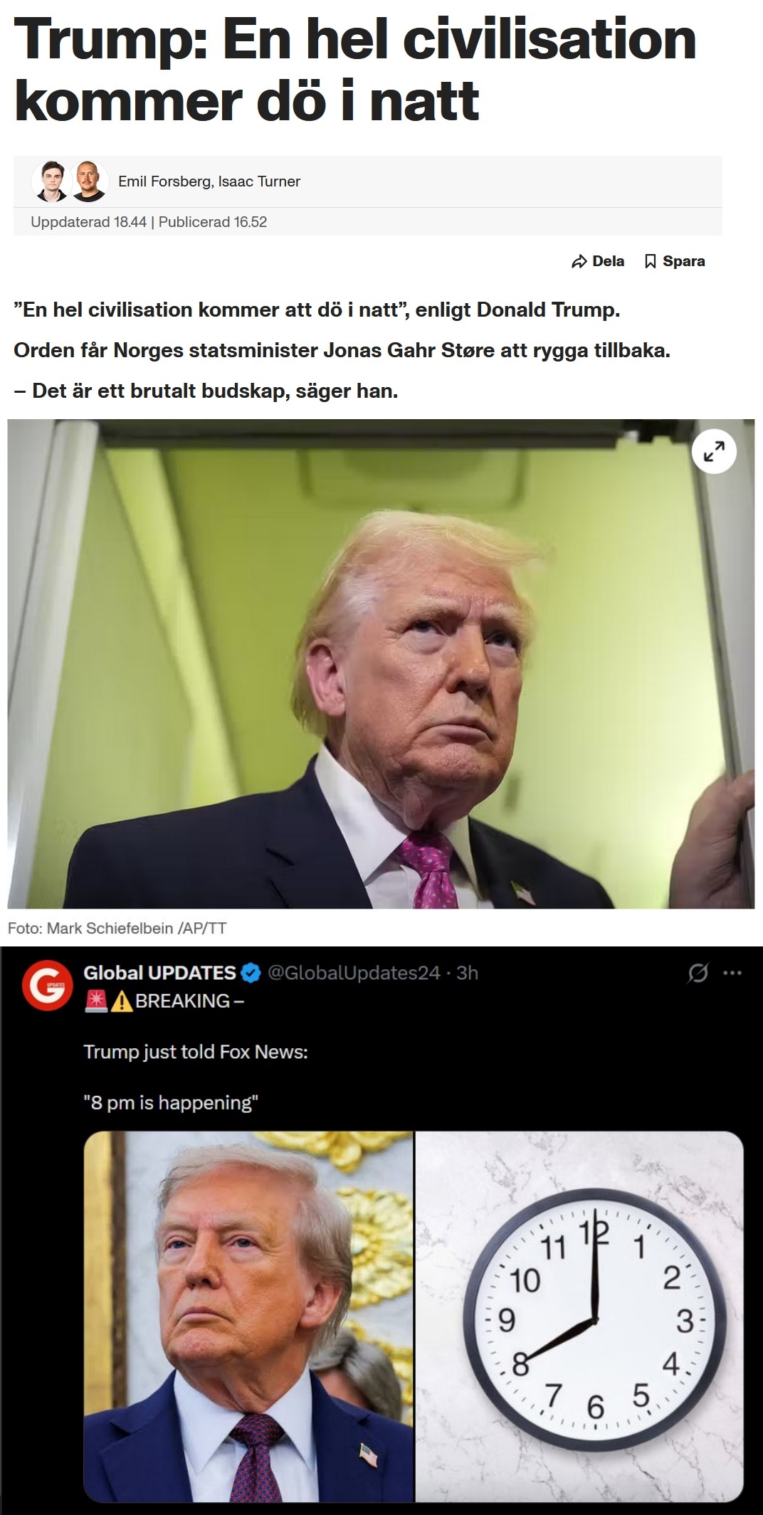 Det är lätt att förstå att man hajar till när man ser ett sådant inlägg, men det finns en mycket viktig detalj här: bilden du delat är en förfalskning.Inlägget i bilden har inte postats av Donald Trump. Här är några anledningar till varför man kan se att det är fejk:>Inkonsekvent språkbruk: Frasen "Praise be to Allah" är extremt osannolik för Trump att använda, särskilt i ett aggressivt sammanhang mot Iran. Det stämmer inte överens med hans politiska varumärke eller retoriska stil.>Brist på nyhetsrapportering: Om USA:s president faktiskt hade hotat att bomba iranska kraftverk och broar på detta sätt för bara två dagar sedan (enligt datumet 5 april 2026), skulle det vara den absolut största nyheten i världen. Inga trovärdiga medier har rapporterat om ett sådant utspel.>Satirisk ton: Termer som "Power Plant Day" och "Bridge Day" är typiska för internet-satir snarare än officiell (om än färgstark) kommunikation från Vita huset.