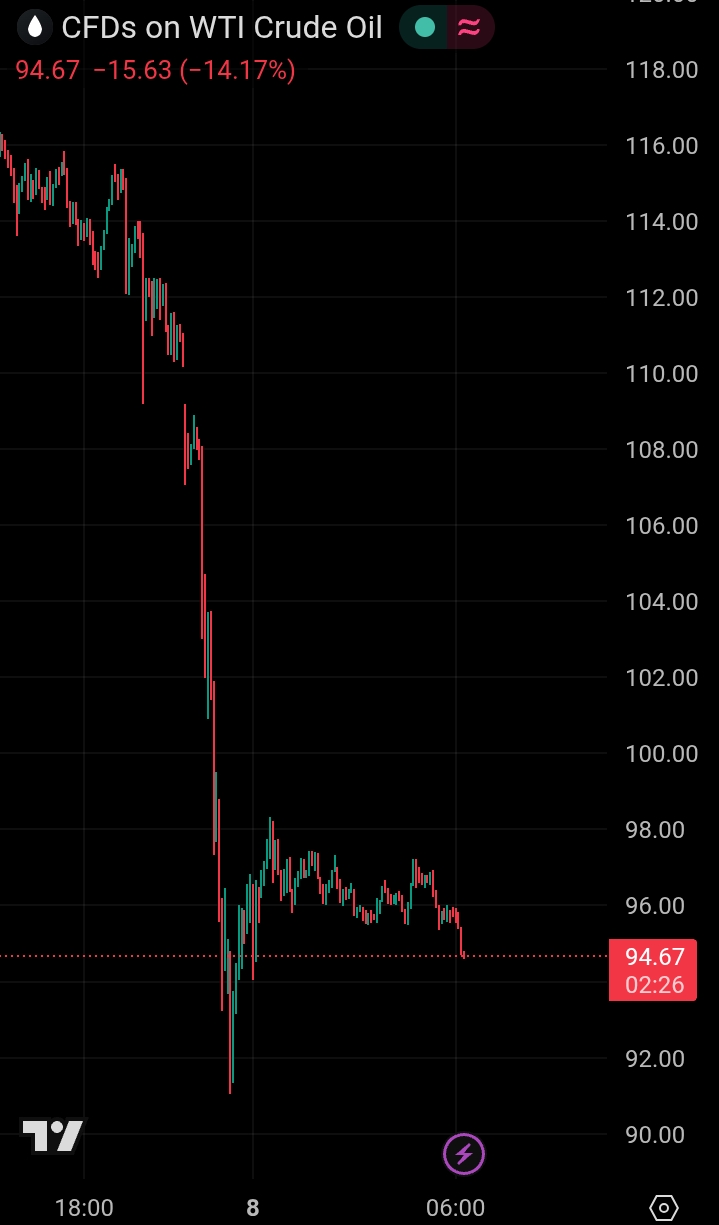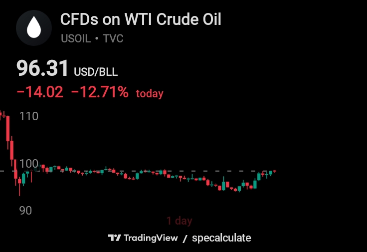 >WTI oil climbing back to 96.38$Will it get back to 100$ today or tomorrow? Most countries have nuked their backup oil storage for this mess and production won't be back to normal for months. Wish i wasn't so broke and could have bought the 91$ dip :(